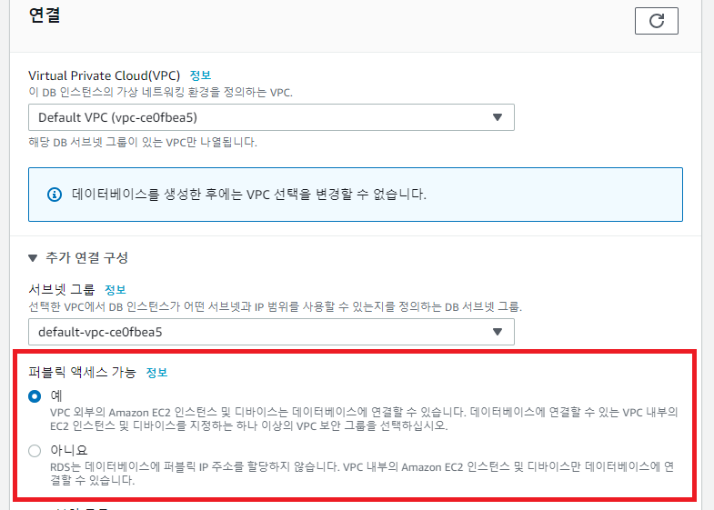 연결에서 추가 연결 구성 탭을 누르고 퍼블릭 엑세스 가능을 예로 바꿔주십시오