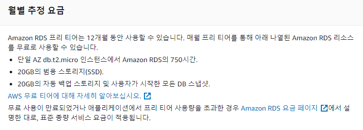 템플릿은 비용이 들지않는(새로가입시 12개월 무료) 프리 티어로 선택합니다. 페이지를 띄웠을때 템플릿에서 처음에는 프로덕션과 개발/테스트만 뜨고 몇초 후에 프리티어가 뜰 때가 있으니, 프리디어가 안보이더라도 몇초 기다리시기 바랍니다.