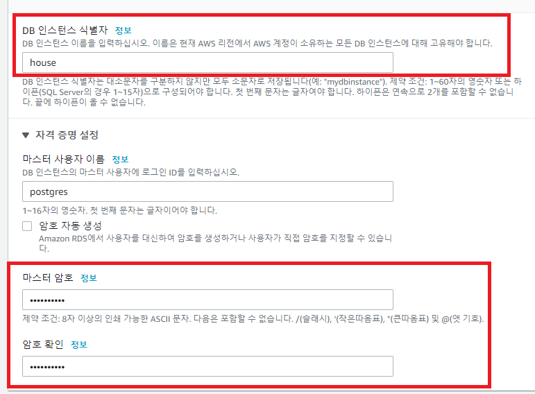 DB인스턴스 식별자와 암호를 설정해주시기 바랍니다.
