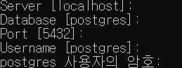 실행후 서버, 데이터베이스, 포트, 이름, 암호등을 입력해줍니다. 암호를 제외한 나머지항목들은 enter를 누르면 기본값들이 입력됩니다.