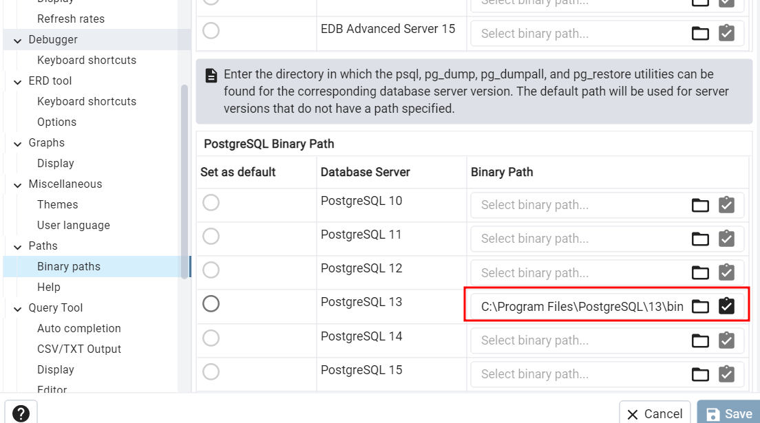 2. 경로를 입력해준다. 참고로 설치된 postgreSQL버전에 입력해야한다. 필자의 경우 postgreSQL 버전이 13이라 해당 path에 입력하였다.