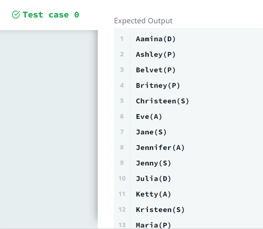 - Query an alphabetically ordered list of all names in OCCUPATIONS, immediately followed by the first letter of each profession as a parenthetical (i.e.: enclosed in parentheses). For example: AnActorName(A), ADoctorName(D), AProfessorName(P), and ASingerName(S).