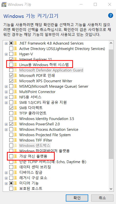 -> Linux용 Windows 하위 시스템 및 가상 머신 플랫폼 체크 해제