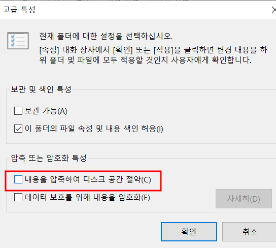 3) 속성 > 일반 > 고급 > "내용을 압축하여 디스크 공간 절약" 의 체크 박스의 체크를 해제.