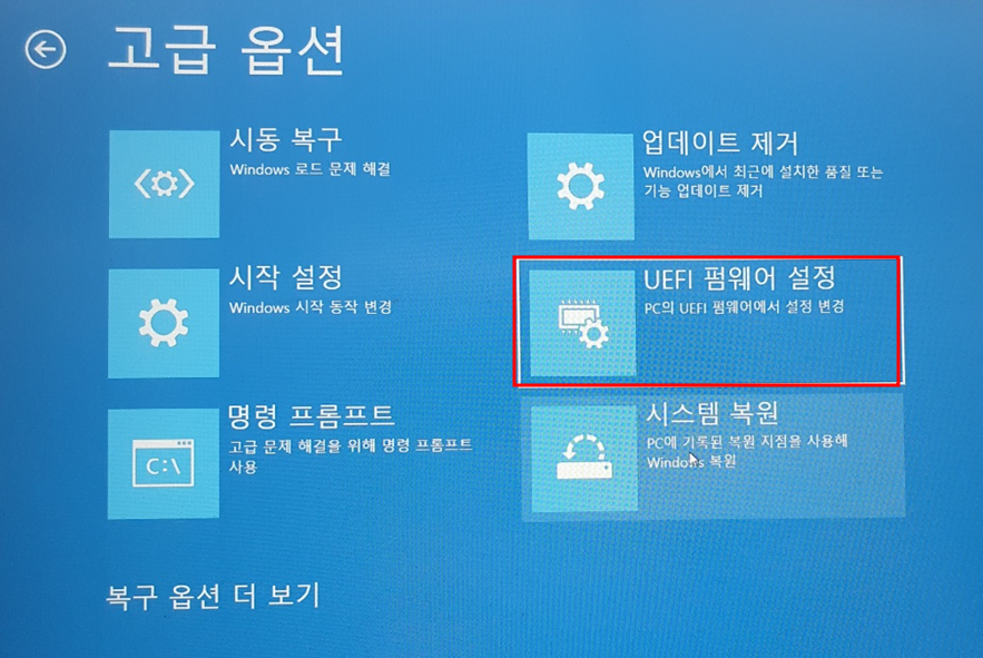 3) 문제해결 > 고급옵션 > UEFI 펌웨어 설정 > 다시시작 순으로 Click 한다.