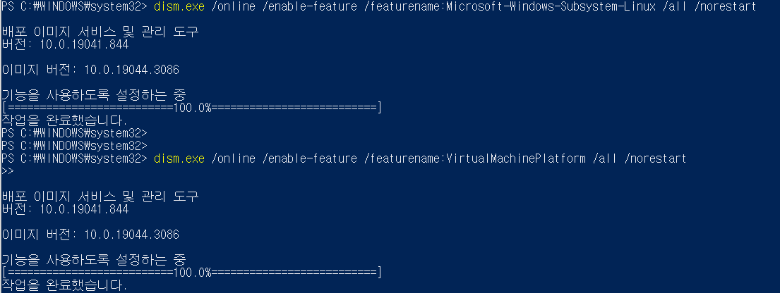 -> Linux용 Windows 하위 시스템 및 가상 머신 플랫폼 다시 체크 후 재부팅