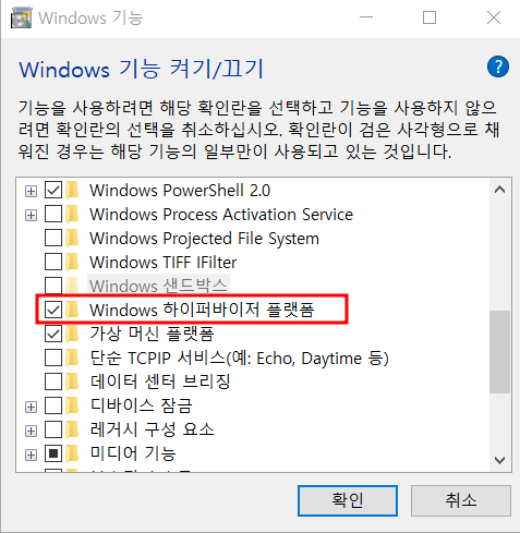 1) Windows 기능 켜기/끄기 > Windows 하이퍼바이저 플랫폼 체크 및 확인