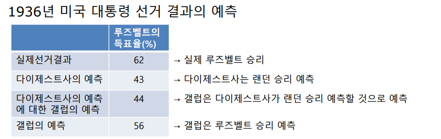 - 다이제스트(Literary Digest)라는 잡지사가 무려 1,000만 명의 유권자에게 설문지를 우송한 뒤 약 240만 명으로부터 응답을 회수