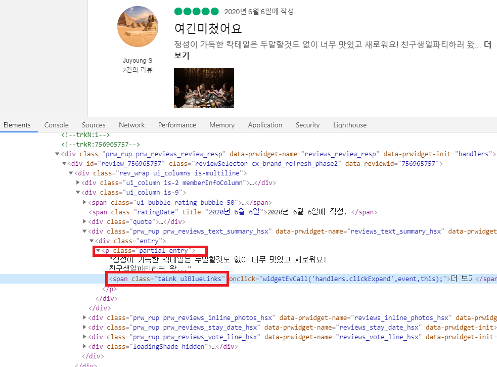 트립어드바이저 댓글은 처음에는 앞부분만 표시되고 나머지부분은 표시가 안되어있다.