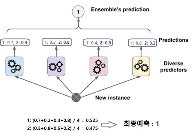 - 다수의 추정기에서 각 레이블별 예측한 확률들의 평균을 내서 높은 레이블값을 결과값으로 선택하는 방식