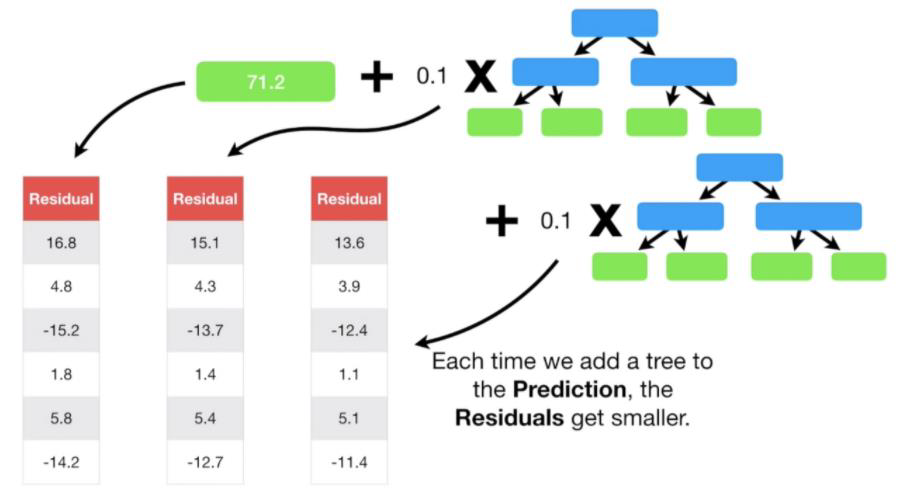 - 줄어든 잔차를 예측하는 트리모델을 만들어 예측한 결과에 학습율을 곱한뒤 이전 예측 결과에 더한다•