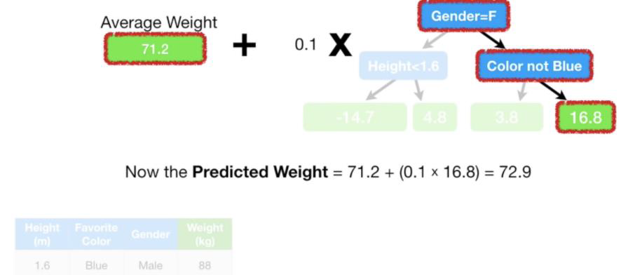 - 그래서 예측한 잔차 오차 에 학습율을 곱한 값을 예측 값에 더한다