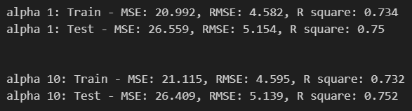 ### 0.1->10 (강한 규제. w가 0에 더 가깝게 된다.)->X가 y를 예측하는 영향력을 작게