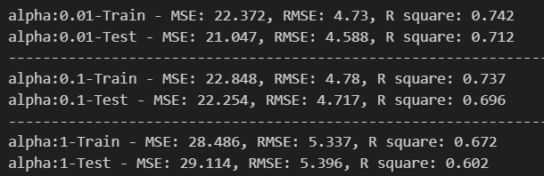 - α 를 작게 하면 규제 (패널티) 정도가 작아 지기 때문에 가중치( β )의 값들의 자유도가 높아져 커짐