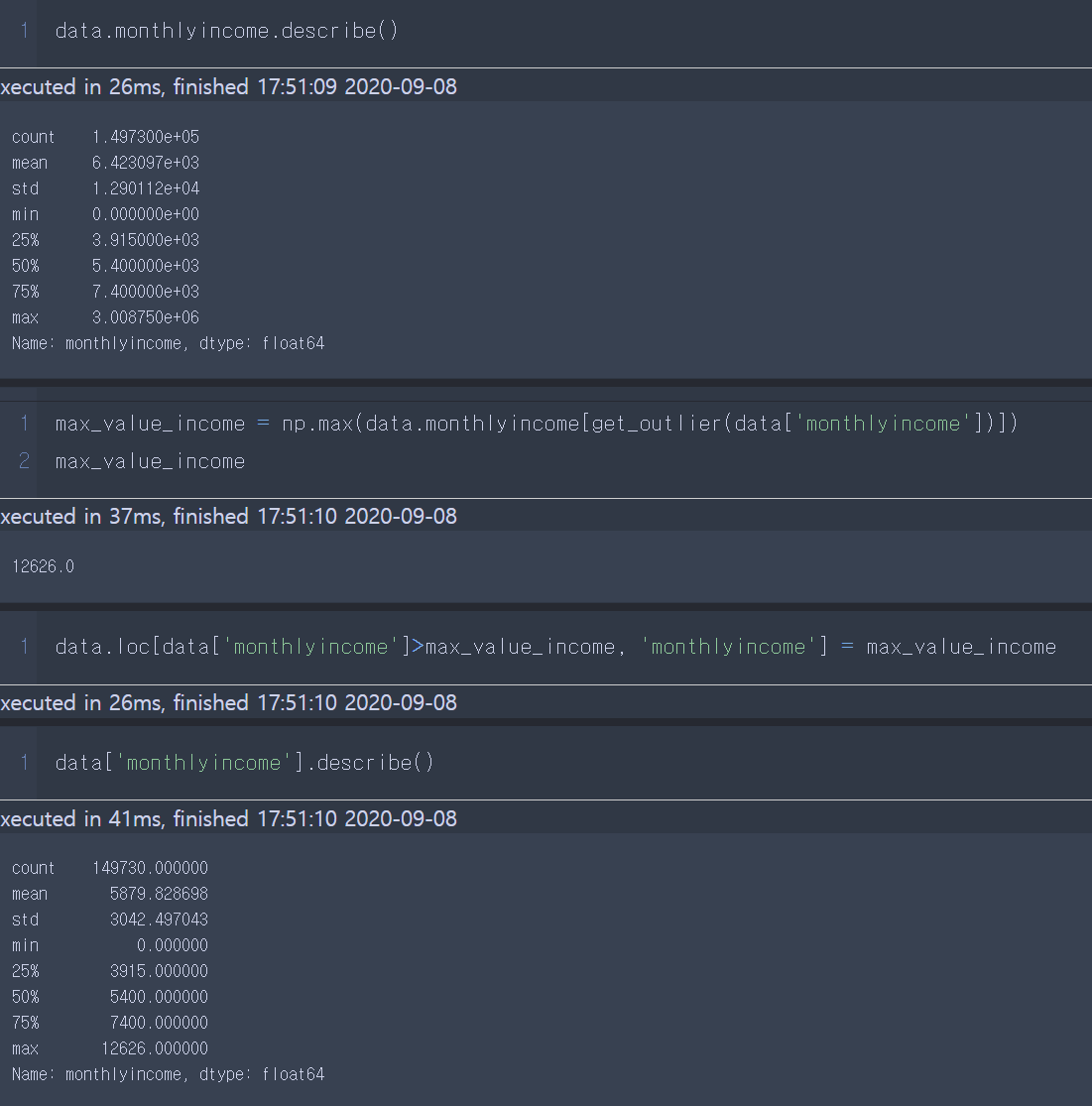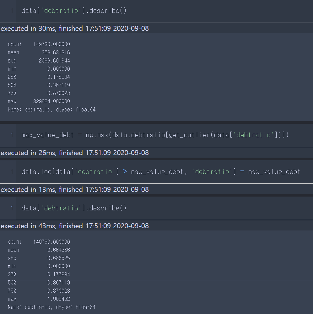 - 이상치를 이상치 아닌 값들의 최대 값으로 대체한다.