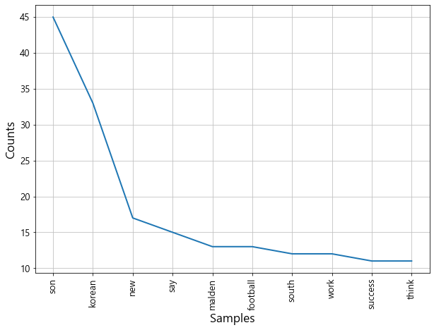news_text.plot(10) # 10 - 빈도수 상위 10개 단어를 선그래프로 그려준다. X축-단어, Y축-개수(빈도수)