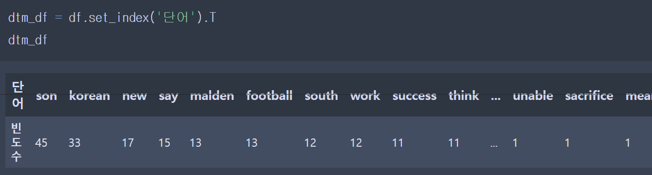 - 문서안에서 문서를 구성하는 단어들이 몇번 나왔는지를 표현하는 행렬