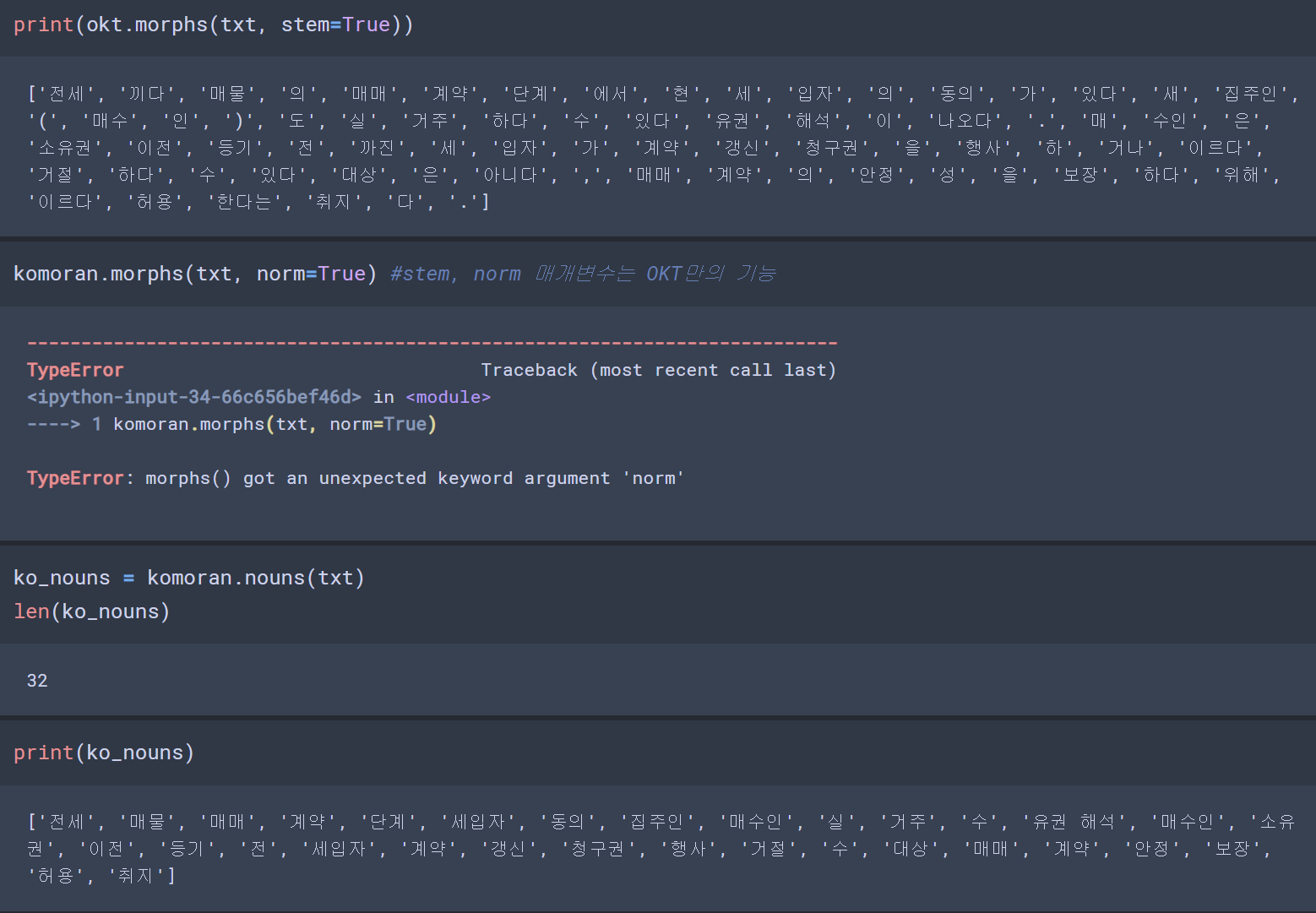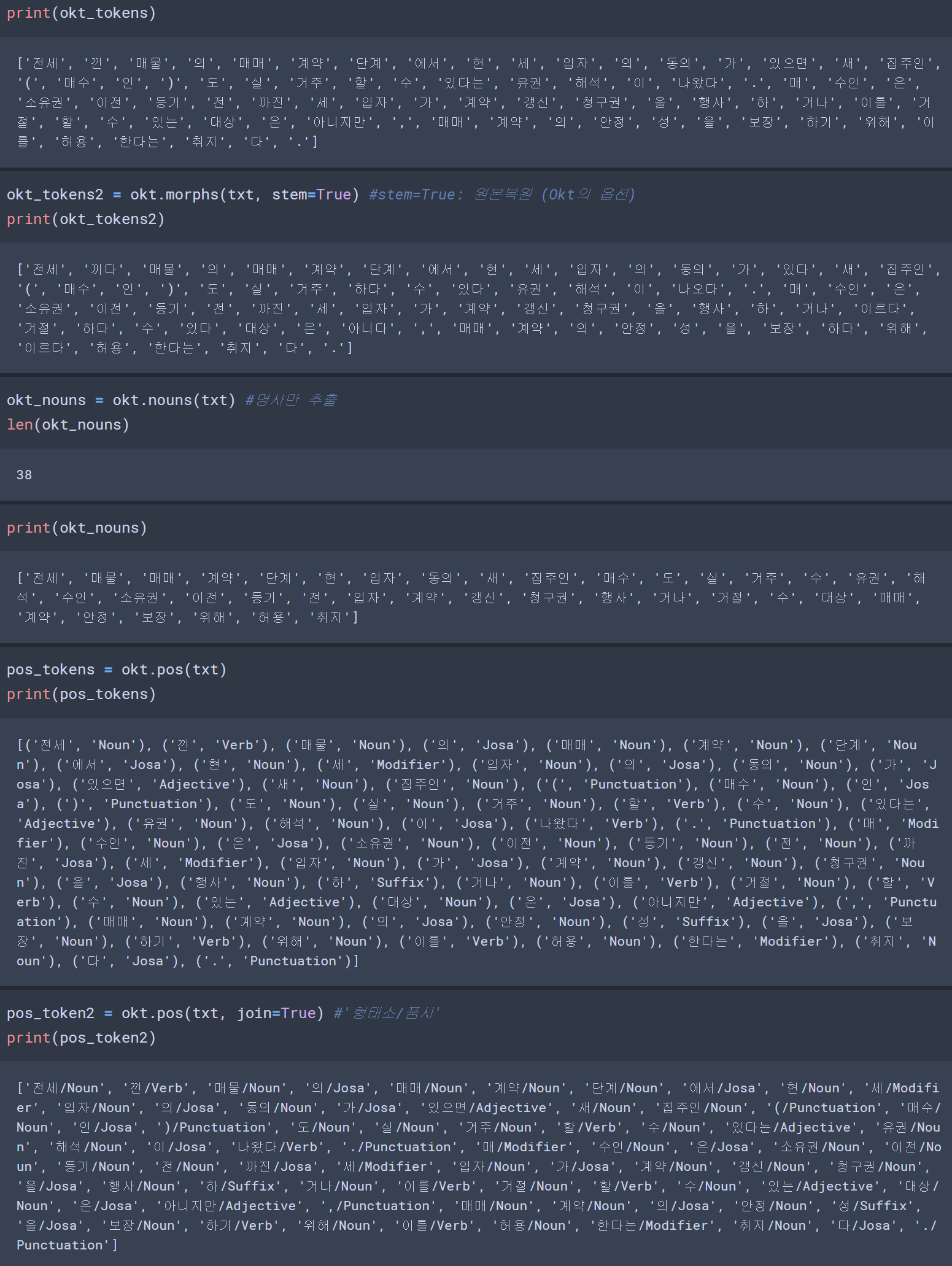 okt.morphs(txt, norm=True) #norm=True : SNS상의 비속어들을 처리해준다. (OKT의 기능)