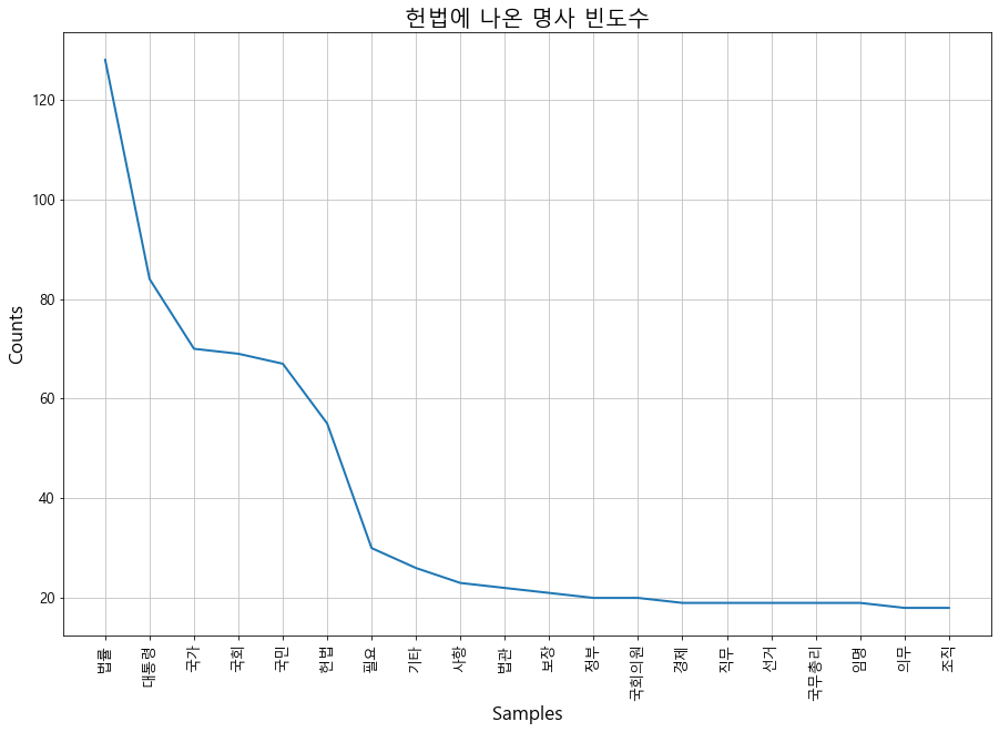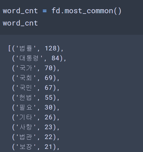 # FreqDist({'법률': 128, '대통령': 84, '국가': 70, '국회': 69, '국민': 67, '헌법': 55, '필요': 30, '기타': 26, '사항': 23, '법관': 22, ...})
