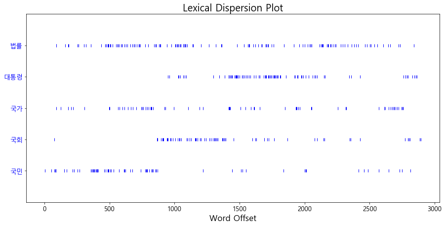 text.dispersion_plot(['법률','대통령','국가','국회', '국민'])