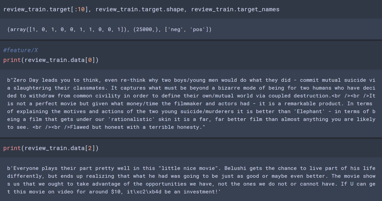 review_train = load_files("aclImdb/train") #분류 클래스 별로 폴더를 만들고 그 폴더에 document text들을 저장.