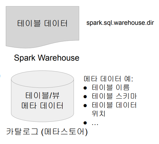 카탈로그 테이블과 뷰에 관한 메타 데이터 관리 메타 데이터 : 데이터에 관한 구조화된 데이터, 다른 데이터를 설명해 주는 데이터이다. 기본으로 메모리 기반 카탈로그 제공 - 세션이 끝나면 사라짐 Hive와 호환되는 카탈로그 제공 - Persistent 테이블 관리 방식 테이블들은 데이터베이스라 부르는 폴더와 같은 구조로 관리 (2단계) 메모리 기반 테이블/뷰 임시 테이블 스토리지 기반 테이블 기본적으로 HDFS와 Parquet 포맷을 사용 Hive와 호환되는 메타스토어 사용 두 종류의 테이블이 존재 (Hive와 동일한 개념) Managed Table Spark이 실제 데이터와 메타 데이터 모두 관리 Unmanaged (External) Table Spark이 메타 데이터만 관리 Spark SQL 스토리지..
